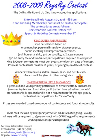 questions, feel free to contact someone on the Royalty Committee. Thank you, Deena Carrier CVRUC-Royalty Director 2008 (6/26/2008) |