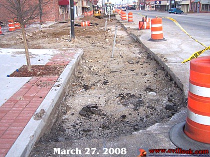 The outline of the new curb edge for the City Hall Plaza at 12th & Main became evident with removal of the old asphalt pavement & underlying bricks as the Downtown beautification project continues. |