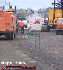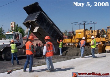 ![]() Pavement for the final 2 lanes of Main between the new bridge and 5th was being forned this morning. The left photo is from the bridge and the photo above shows the progress of the paving machine (at Karen's) by about 10:30am. -- Ted -- Monday 5/5/2008 |