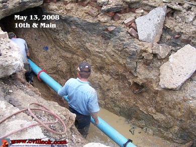 This May 13th city work on the water main under Main Street (just west of 10th & Main) has since been covered up and work continues on all 4 areas within the 2 block construction zone. (Previous Coverage) |