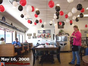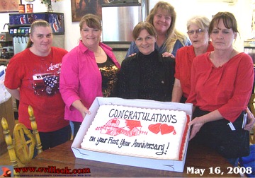 Barnhardt's Restaurant was sharing cake with their customers as they celebrated one year in their new building (Friday May 16, 2008). This followed a 2006 fire and rebuilding on the same site just west of 5th & Main. Owner Janet Wilson (center) is shown with her staff (Not in photo order: Regina Pevehouse, Wanda Brown, Leah Barnhardt, Wandina Hudson, and Lea Emiffy). |