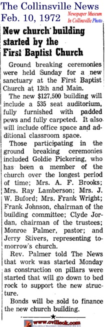 The Collinsville First Baptist Church just celebrated a 100th anniversary which started with this 1908 vintage building occupying the corner of 13th and Main. The current Baptist Church building was dedicated in September 1972. |