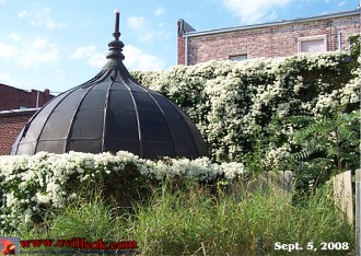 Those who have used the post office drop off box in the alley recently will likely have noticed the mighty display of blooms on the vines surrounding the dome behind the (closed) "Woodruff Spacious Skies" art museum. |