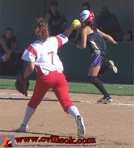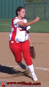 needed in the first game as Kylee Cole (#7 right) pitched a no-hit shutout with