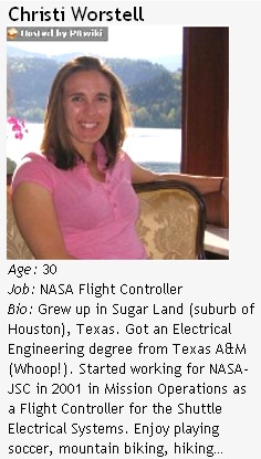 Christi Worstell is on a trip of a lifetime to Nepal. She is a member of a group of 25 friends and family associated with Sabrina Gilmore, EVA flight controller for NASA/JSC, who is coordinating this trip. As a member of this outreach and scientific team, they will participate in exploration, scientific studies and philanthropy. The highlight of the trip will be the assent to Mt Everest Base Camp (18,500 ft) later this week. Christi, granddaughter of Dorothy Worstell and daughter of Earl Worstell of Sugar Land, TX, is a NASA flight controller, Missions Operations for Shuttle Electrical Systems. To check out the teams progress, go to http://2009everesttrek.blogspot.com/ Susan Worstell (4/20/2009) |
