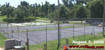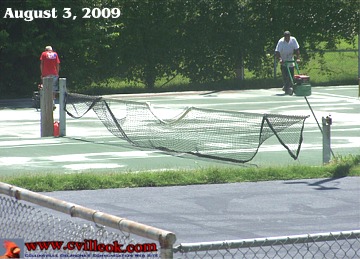 | Two of the City Park tennis courts already had at least a portion of the new surface applied by Monday morning (Aug. 3rd). The other two courts were still being smoothed. |