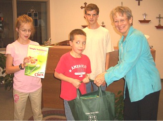 Kathey Childers, representing Faith Lutheran Church accepts food donated by Tulsa County 4-H V.O.I.C.E. Presented by Dairy Capitol Club secretary Emily Haan, Club member Greg Haan and Club vice president Tyler Lutz. -- Photo by Deb Lutz |