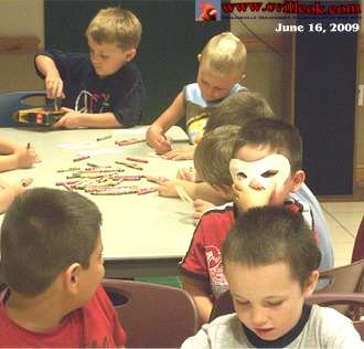 | After listening to a few books about masks, a room full of kids started coloring their own masks at the Collinsville Library Tuesday June 16th, 2009. There are a series of kids events at the library each Tuesday this summer. |