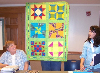 | Mitzi Aziere (left) admires a sampler quilt made by Janet Martin (right). |