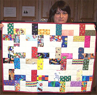 is of Janice Coke, displaying a quilt for Newborns In Need. |