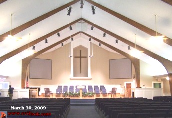 Sunday services have been held in the newly remodled First Baptist Church Sanctuary the past two weeks following nine weeks of services in other parts of the building while major revisions were being made. One of the most obvious changes is movable chairs instead of fixed pews on the new carpeting. |