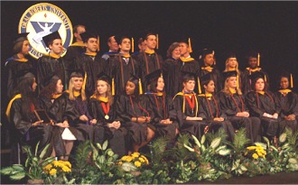 Davie is in front of the ORU symbol in this departmental hooding ceremony held May 1st. |
