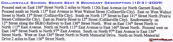 The Board of Education of Collinsville Public School District hereby announces that statutorily qualified individuals interested in running as a candidate for the #5 seat on the Collinsville Board of Education may file to run as a candidate for this seat at the Tulsa County Election Board between the hours of 8:00 a.m. and 5:00 p.m., or when the Tulsa County Election Board closes for business that day, December 7 through December 9, 2009. |