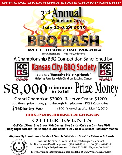 City Park. The second is a flyer for the KCBS Championship BBQ in July at Ft. Gibson Lake, it is a benefit for Hannah's Helping Hands. The reason I am sending it to you this early is that they are accepting the competitor applications now. If you could post it as well or as soon as you can that would be great also. Thank you, Janet Pavey (President) Hannah's Helping Hands (4/19/2010) |