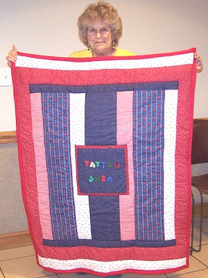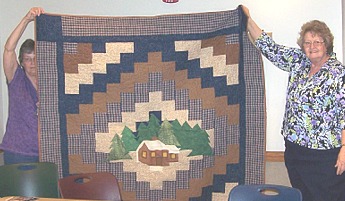 Mary Wood shows off her recently completed "Cabin in the Woods" quilt, and Candy Reisinger displays a grandchild's quilt made in vertical stripes (below). |