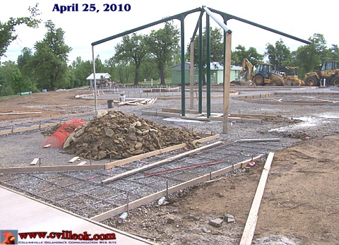 | What I assume is the frame for the shade structure (that will be situated between the play ground and splash pad areas in the City Park) was taking shape this past week as construction continues on park improvements funded by the additional city sales tax approved in April 2009. (Previous Coverage) |
