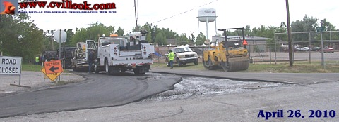 | Tulsa County crews and equipment arrived in Collinsville last week to start the long awaited street overlay improvements but were called off for a bridge repair emergency. They were back in Collinsville today (Monday April 26, 22010) and had several blocks of Maple Street (east of 19th) covered on one lane by mid day and will continue with other planned street. (Sept. 2009 Map of Planned Overlays). The improvements are funded by the additional city sales tax approved in April 2009. |