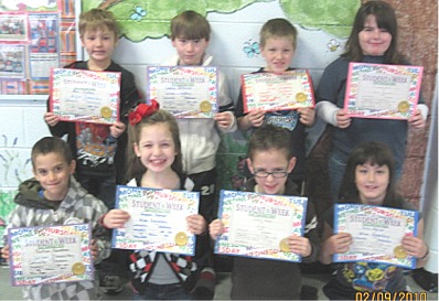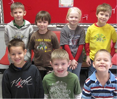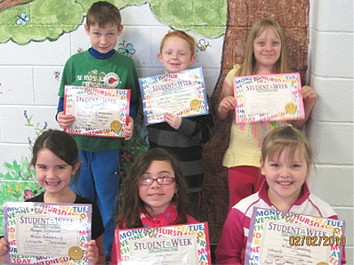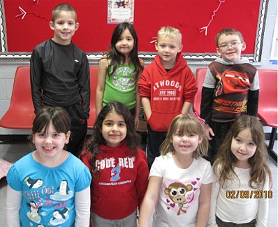 grade classes chosen for Compassion (February 2nd) Front row (l-r) Morgan Dickinson, Ramsey Keim, and Haylee Fox Back row (l-r) Caden Lundy, Nathan Watkins, and Simone Sharitt |