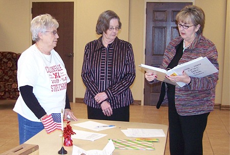 L-R: Agnes Fisher, Louise Brazeal, as Jeanie Barnes officially welcomes them to the Collinsville Home Representative Club |