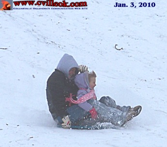 I made my first trip to the Collinsville City Park Sunday (Jan. 3rd) since 3 snows have fallen started Dec. 24th. This pair had the sled hill to themselves mid-day Sunday but there was a pile of broken sleds at the bottom of the hill from the previous week. -- Ted |