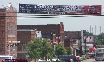 | The grand opening ceremonies for the City Park Improvements, the First Baptist Church's "Homeland Celebration" recognizing veterans, and the normal 4th of July fun and fireworks in the park are noted on a new banner. The banner was installed across Main Street (near 13th) Thursday June 24, 2010. More later on all these activities ... and there should also be a flyer in the next city utility bill mailing. -- Ted |