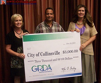| When you are watching the skys light up with fireworks Sunday night (July 4th) over Collinsville City Park you can thank GRDA for helping the City fund the annual event. City Manager Pam Polk (left) and Mayor Stan Sallee accepted an oversized $3000 check from Grand River Dam Authority's Laura Schuchman Tuesday June 29th, 2010 at City Hall. GRDA is the city's electrical provider. |