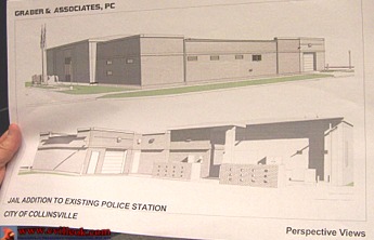 Plans for adding a new jail extention to the Collinsville Police Station at 11th and Center were approved by the City Commission Monday March 15, 2010. Architect Jim Graber presented the plans to the commission and said documents should be ready to go out for bids soon for this city improvement funded by the city sales tax increase that began in July 31, 2009. The city has been without a jail since the Dec. 1, 2001 City Hall fire with Owasso housing Collinsville prisoners on a fee agreement since then. |
