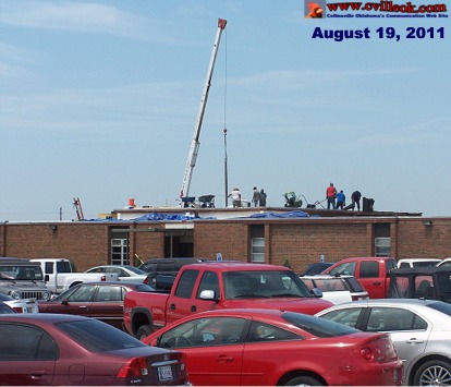 | On my way to the CHS Softball Festival Friday afternoon (8-19-2011), noticed that repairs were in progress for the portion of the roof over the CHS art room that was damaged August 10th. Highwinds that morning (a day before the start of classes August 11th) allowed several inches of water into the art room. |