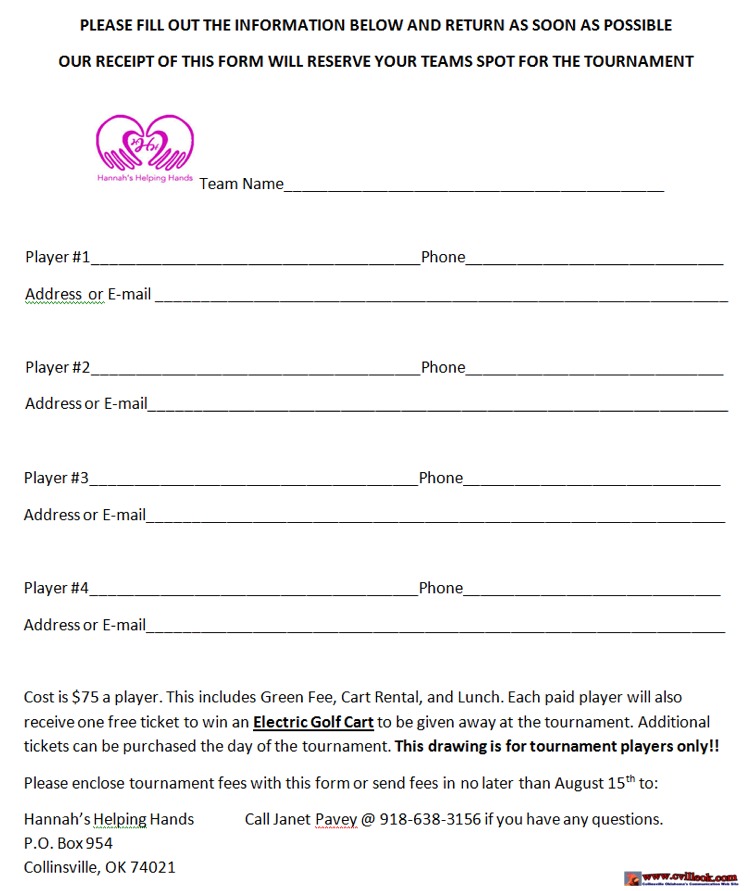 25th. If you have any questions please contact Janet at 918-638-3156 or by e-mail: hannahshelpinghands@yahoo.com. WE ARE GIVING AWAY A GOLF CART THIS YEAR AT THE TOURNAMENT! Each paid player will receive one free ticket for the drawing to win the golf cart. Additional tickets can be purchased at the tournament. There will be no outside sale of tickets to win, this is for tournament players only!!! God Bless & Have Great Day! Janet Pavey President -- Hannahs Helping Hands (8/17/2011) |