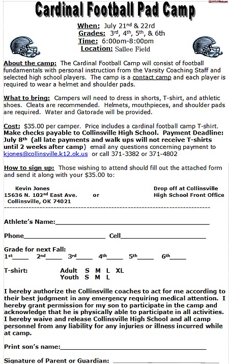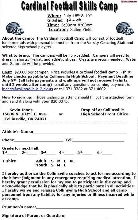 (email questions/comments to wrightted@aol.com). Ted Wright -- last update 7/14/2011 (FootballJrCamps.html) www.cvilleok.com Copyright 2011 -- Collinsville, Oklahoma |