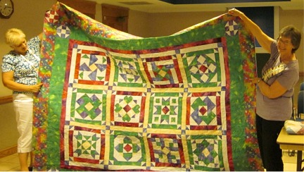 | Audrey Engles (right) displays her quilt made from last year's "block of the month" patterns. Sherry Neph (left) assists in the display. |