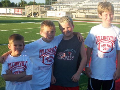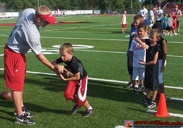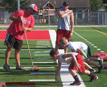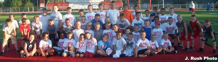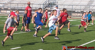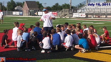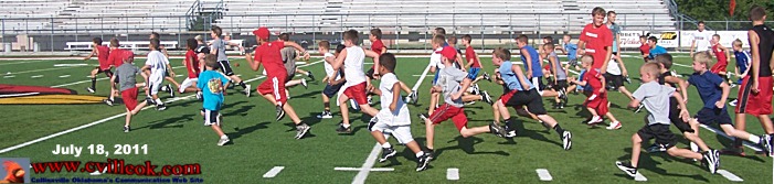 The photo above shows 1st-4th grade football players sprinting to the center of Sallee Field to be greeted by CHS Head Football Coach Kevin Jones (below). This was Monday evening July 18, 2011 for the first of two sessions for basic football skills for the youngsters. The next camp starts Thursday for 3rd-6th graders and will be in pads. The camps are instructed by the CHS football coaches and a few members of the 2011 High School Football Cardinals. |