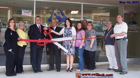 Business partners Brian Smith and Stacy Brown (holding the scissors) have opened Castle Rock Financial Advisors at 1107 W. Main in Historic Downtown Collinsville. They have made a substantial investment in the building and invite your business. Sandy Henry will be at the front desk for the business. They were joined by Collinsville Chamber of Commerce members Thursday for a ceremonial ribbon cutting. Stacy has been in business on Main Street here for 9 years with a different firm. Brian was with the same firm on 76th Street in Owasso for 16 years. |