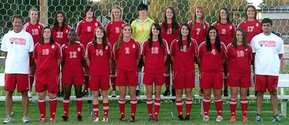 The Slipper Fits! Cinderella has made it to the dance. Northern has advanced to their first ever national tournament with a 2-1 win over Lewis and Clark College in the NJCAA District C Final. Megan Young started the scoring fifteen minutes into the game with what might have been the best goal of the year in the NJCAA. Megan took the ball in front of the Mavs own penalty area and dribbled nearly seventy yards through almost the entire Lewis and Clark team before scoring. The Trailblazers evened the score before the half with a long shot aided by a stong wind that went over Ashleigh Trainer's head for a goal. Northern took the lead for good early in the second half when Jade Ovendale headed in Natalie Swingle's corner kick. Tiffany Hale scored what looked like the game clinching goal late in the game, but she was called offsides and the goal was not allowed. Northern then held off a series of attacks from Lewis and Clark for the win. The Mavs record is now 13-4-1. Seven Mavs Selected to All Region Team Megan Young, Sophomore,
