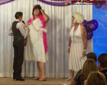 | You could probably question the "beauty" or hormones of the contestants in the WoMANless Beauty Pageant Saturday, but not the laughter and smiles of the crowd that helped raise money for Hannah's Helping Hands. This was the 3rd annual event and was held in the vacant Ostrander's Appliance building before a packed crowd. I have just a sample of the "beauties" shown here. -- Ted | ||