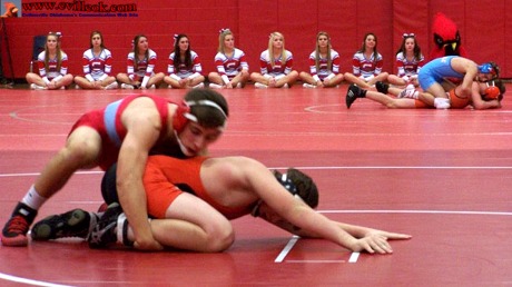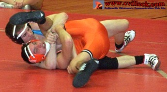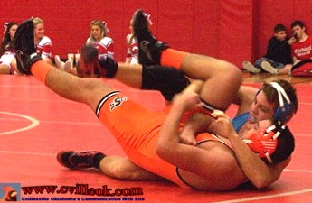 Arnold (left in red) was wrestling for an 8-2 JrHi win over Sperry while Christian