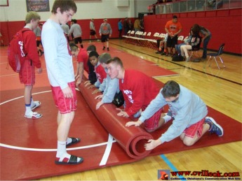 JrHi wrestlers rolled up their mat for storage while the HS matches continued