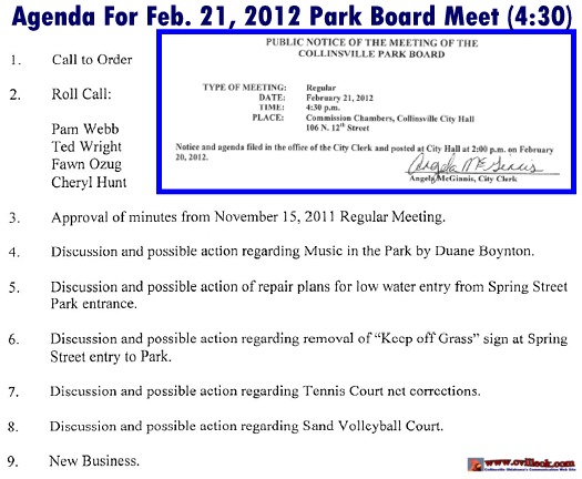 (email questions/comments to wrightted@aol.com). Ted Wright -- last update 2/22/2012 (CityParkBoardFeb21.html) www.cvilleok.com Copyright 2012 Collinsville, Oklahoma |