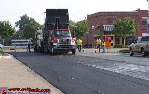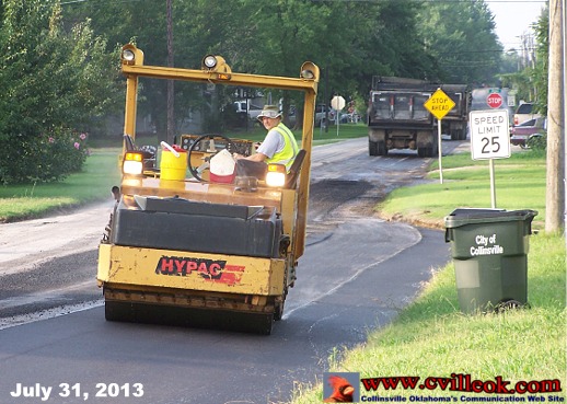 | Tulsa County workers were applying asphalt to South 12th Street Wednesday August 31, 2013. I belives the new surface was to reach from Main Street to the railrord crossing south of town. Collinsville pays for the material and Tulsa County crews supply the machines and labor. The 12th Street project has been planned for months but waiting for the Tulsa County crew be be available from other county projects. |