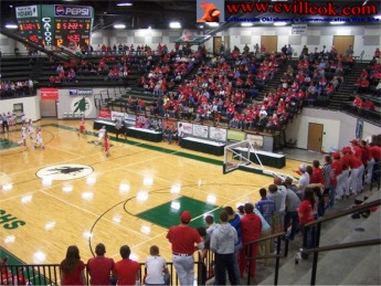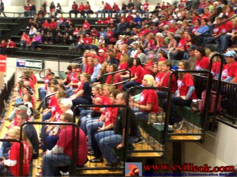 side of the gym was full of red shirted Cardinal fans with studends standing
