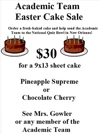 Supreme or Chocolate Cherry 9x13 sheet cake for $30. Cakes will be ready on Friday, April 18! Order Form and flyer are attached. Thanks! Betty L. Gowler Academic Team Coach (4/11/2014) |