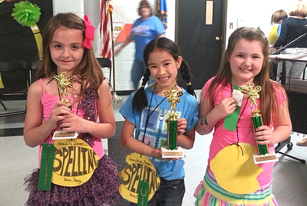 | 2nd Grade Spelling Bee Winners -- (l-r) Lily Glover (3rd place), Janae Mangan (2nd place), and Leah Rule (1st place) |