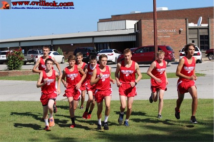 Collinsville High School Cross Country Boys Team -- (L-R) Bottom Row: Devon Lyon, Dylan Myers, Ethan Thomas, Spencer Beeson, and Zac Sellers. Top row: Head Coach Eric Dutton, Morgan Cooper, Brayden Little, Erik Tollefson, Levi Captain, and Coach Kacee Price. |