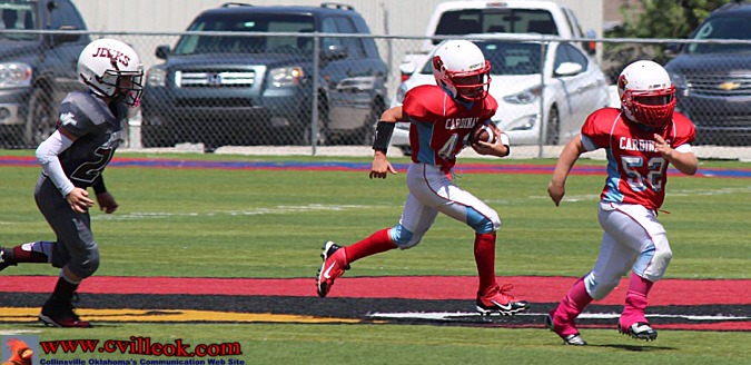 | Chance Castillo (#15) had taken a handoff from QB Jack Keith and headed before handing off to Kanden Reed (#21 above) for a reverse and Collinsville's only score of the game. (Below) Reed is still near midfield before reaching the right sideline and then the endzone. That tied the score at 6-6 with 5:53 left in the 4th quarter. Regulation play ended at 6-6, with Jenks scoring in their portion of overtime for the win. | ||||||||||||||||||||||||||||||||||||||||||||||||||||||||||||||