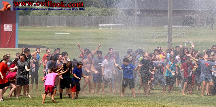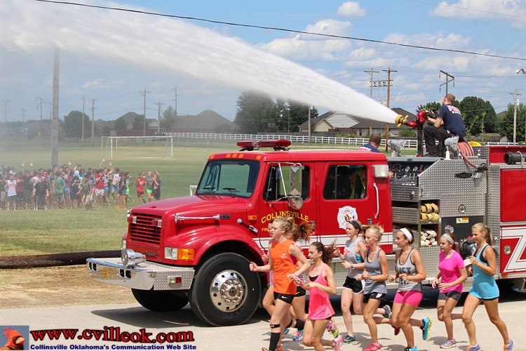 | The CHS Girls Cross Country Team was just beginning their practice run Thursday as the 5th graders were being doused on the soccer fields just north of ECC/Herald. I'm guessing if they had already run a few laps they might have diverted their path to cool off in the spray also? -- Ted -- The cross country teams had opened their season at Ponca City the day before (Aug. 28th). | ||||