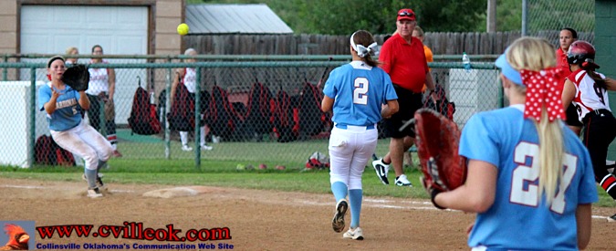 to Ravyn Murphy (#5) covering first and her throw to Makayla Bowman (#23)