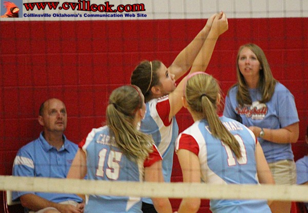 | Mia Bowers (#5) with a hit in the 9th grade games here -vs- Skiatook had her grandfather Pat Herald watching in the background. | |||||