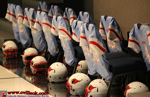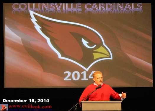 | CHS Coach Kevin Jones spoke about another outstanding football season and the contribution to the building "Legacy" by a fine group of seniors. The Collinsville Quarterback Club hosted the banquet for the players and their families Dec. 16th at the Faith Fellowship Church. |