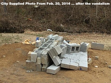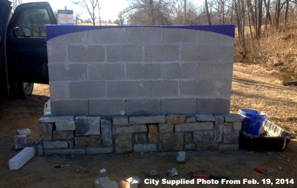 | City officials reported last Thursday (Feb. 20, 2014) that the new City Park entrance sign (on the east side near 15th Street) was damaged sometime during the previous day or evening by vandals. The sign is a miniature version of the larger sign on the west side of the park near 19th Street. The upper concrete blocks of the in-progress construction were knocked over and have since been restored. If you have any information on the vandalism please contact the city or police department. |
