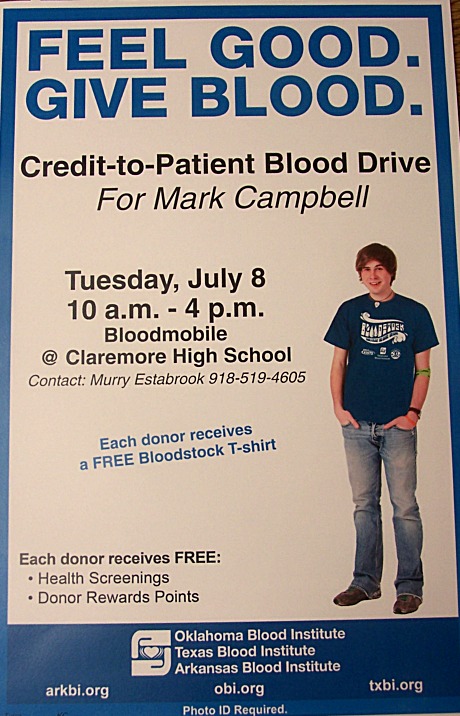 Collinsville Cardinal Family ...please get out and support Coach Mark Campbell's Family by donating blood Tuesday July 8th at Claremore. Help the family pay back some of the blood used in Mark's fight with cancer. All blood donated will be credited to Coach Campbell's account. |